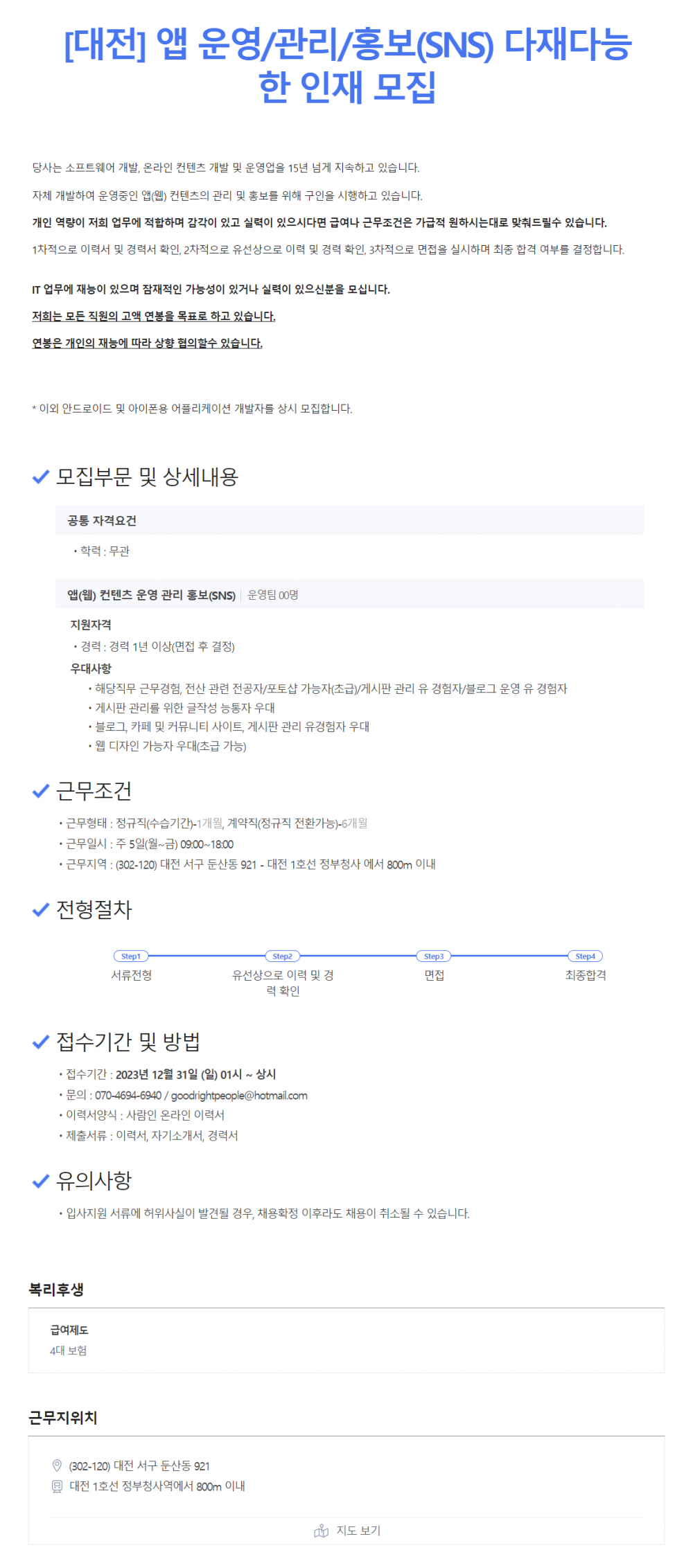 [상시모집] 앱 운영/관리/홍보(SNS) 페이지 정보 작성자 관리자 댓글 0건 조회 4,847회 작성일 2023-12-31 10:56 본문 목록 글쓰기 다음글[상시모집] 안드로이드/iOS 앱 개발자 2023-12-31 댓글목록 댓글목록 등록된 댓글이 없습니다.